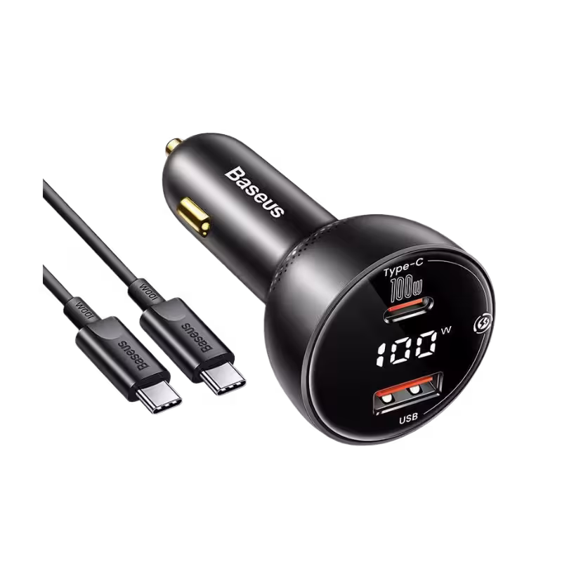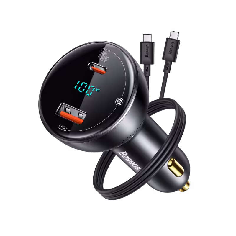 The Baseus 100W USB-C Car Charger transforms your vehicle’s 12V outlet into a high-powered charging station. With one USB-C port that delivers up to 100W and a second fast-charging port for your phone or tablet, it’s ideal for powering laptops, smartphones, and other high-performance devices on the go. Its built-in safety protection and digital LED display ensure reliable and efficient charging in any car.