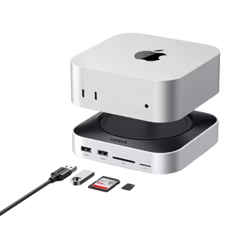 The UGREEN CM841 is the definitive workstation expansion designed specifically to match the unique form factor of the Apple Mac mini M4 and M4 Pro. This 11-in-1 docking station transforms your compact Mac into a powerhouse by providing a wide array of high-speed ports and a built-in M.2 NVMe SSD enclosure that supports up to 8TB of storage. With theoretical transfer speeds of 10Gbps, it handles 4K video editing and large file backups with ease while maintaining a perfectly clean desk setup. The thoughtful design includes a bottom-groove cutout for easy power button access and conductive shielding to prevent common Wi-Fi interference issues. Crafted from premium aluminum to match the Mac mini's silver aesthetic, the CM841 is the ultimate tool for creative professionals and multitaskers who need more connectivity and local storage without the cable chaos.