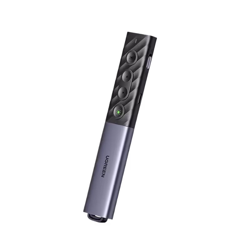 The UGREEN laser pointer is an upgraded PPT smart dual-interface laser page turner. It uses a standard 3R-type laser module with a large spot size and high brightness, accurately marking key points and focusing the audience's attention. It supports remote control up to 100 meters away, suitable for various scenarios. The receiver features a USB + Type-C dual-interface interface, making it fully compatible with all laptops. It is primarily used in conference presentations, training sessions, and other similar scenarios.